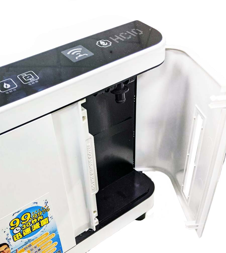 電解液提示燈會隨著電解液水位而變化:剛開瓶的電解液燈號呈鮮綠色、逐漸變為黃、橘、最終轉為鮮紅色;當電解液用完,指示燈將開始閃爍,此時生成機也將發出蜂鳴聲並停止運作